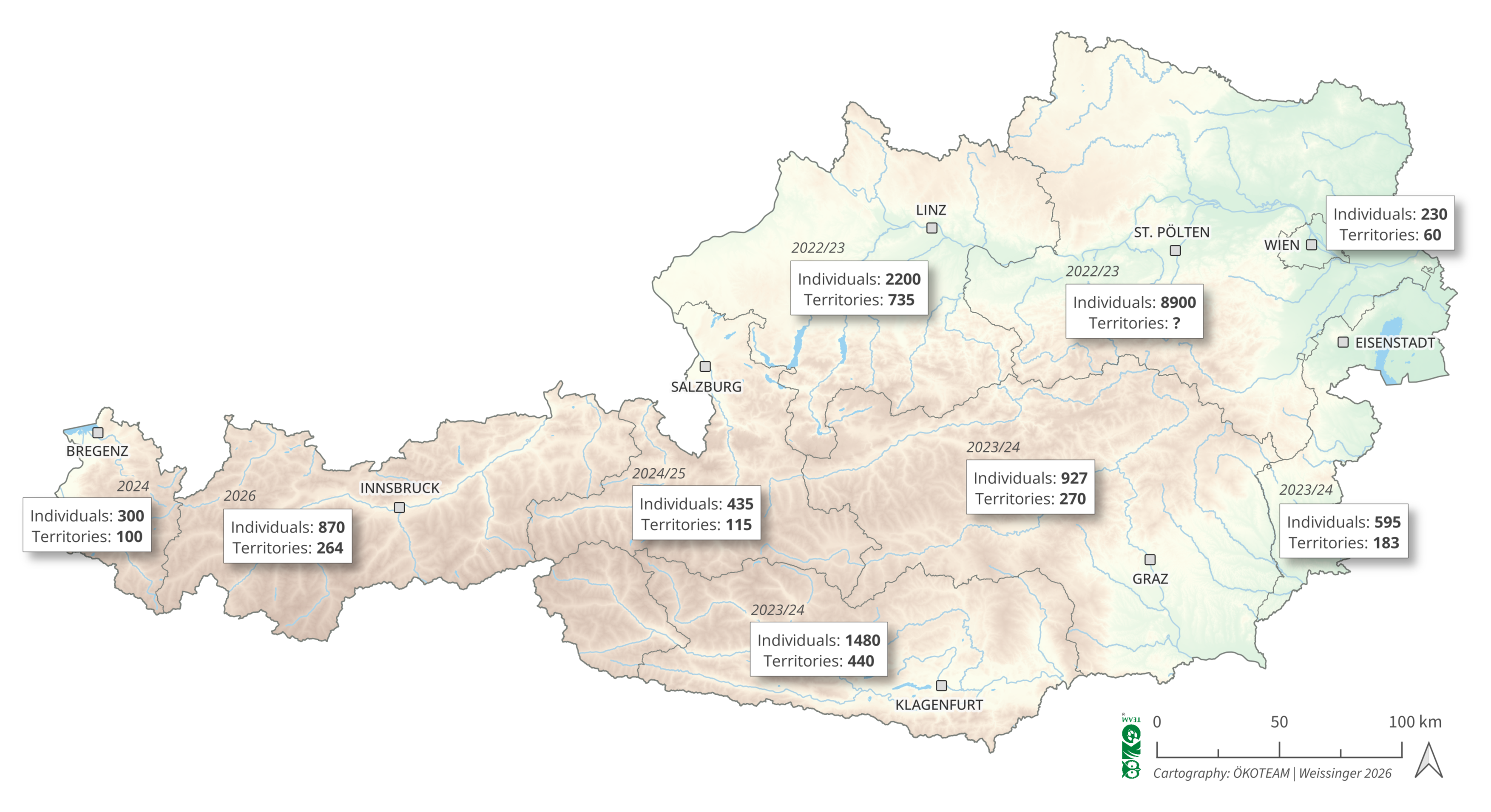 - Oberösterreich: Ökoteam (2023): Biberbestandsermittlung Oberösterreich: Revierkartierung, Bestandsanalyse & Erhaltungszustand (Phase 2). Projektbericht im Auftrag des Lands Oberösterreich, Direktion für Landesplanung, wirtschaftliche und ländliche Entwicklung, Abteilung Naturschutz, Graz, 255 S.